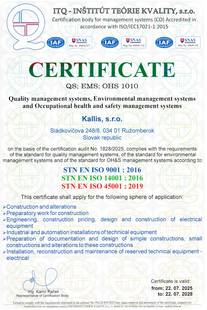 Naša spoločnosť je certifikovaná podľa noriem ISO 9001, ISO 14001 a ISO 45001.